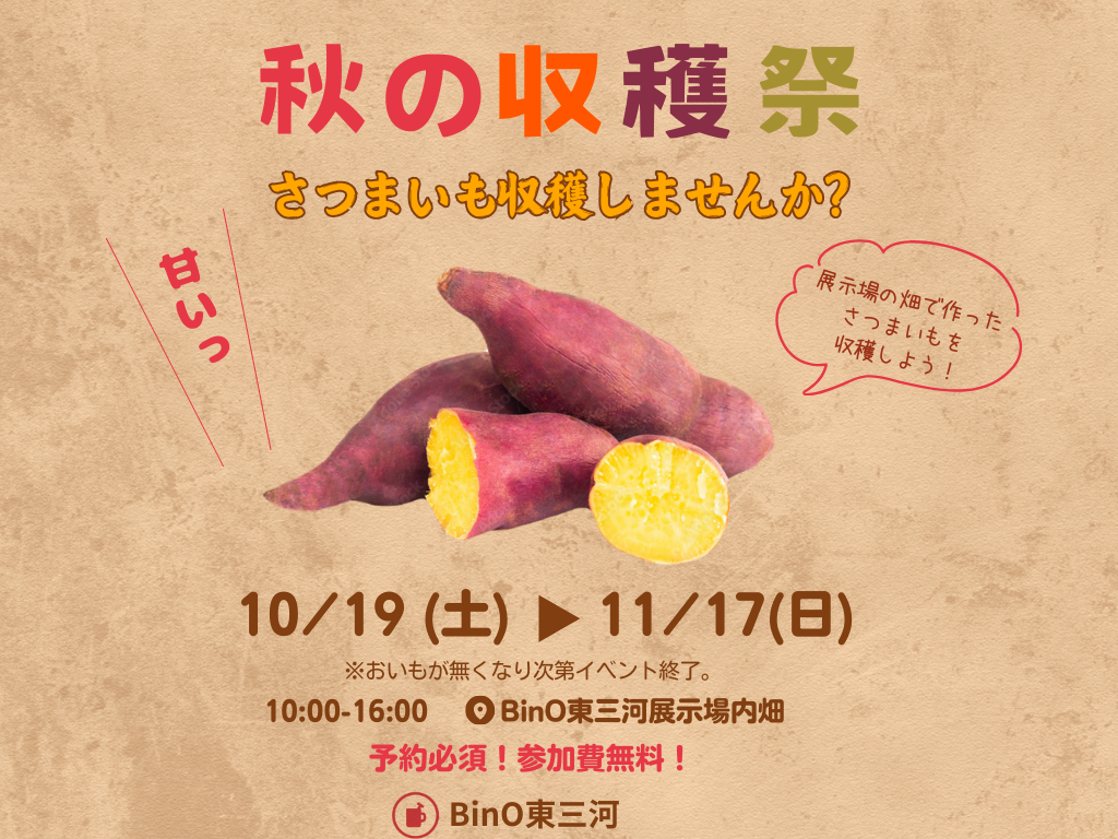BinO東三河展示場の畑でひそかに育てていた”さつまいも”も、ついに収穫の時期となりましたので、多くの皆さんに”さつまいも”を食べて頂けるように”さつまいも”収穫祭を開催します!!収穫した”さつまいも”はお家に持ち帰り様々なメニューにしてお召し上がり下さい。
