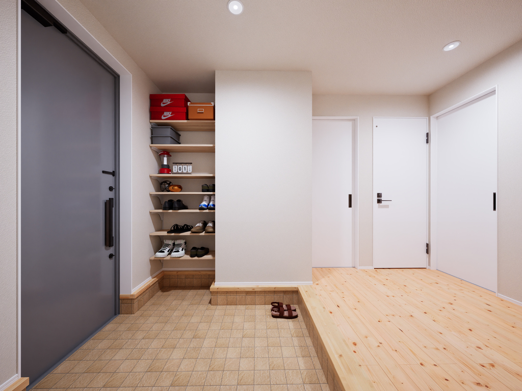 1階の一部土間にし、住まい手が自由にアレンジできるフリースペースとストッカースペースを標準設定しました。