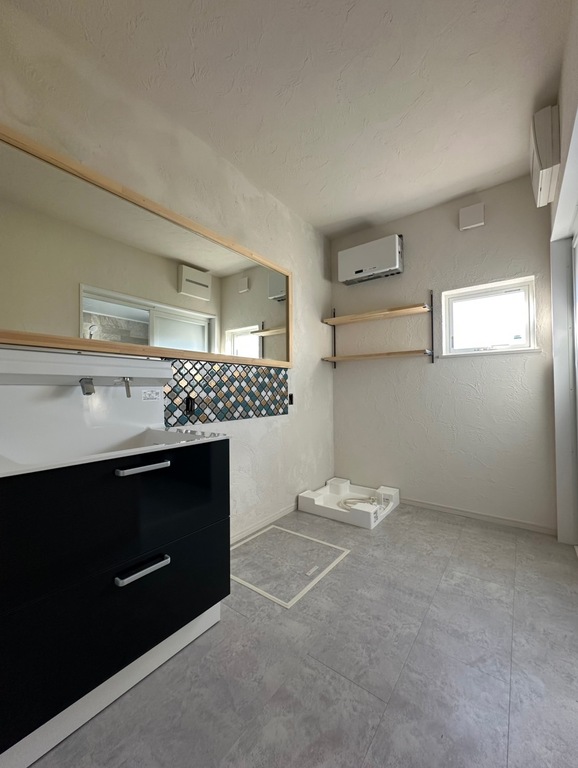 システムの化粧台の使い勝手をそのままに、大きな鏡を設置。