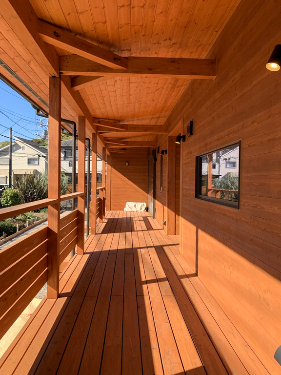 家の正面を彩るワイドデッキと板張り仕上げ