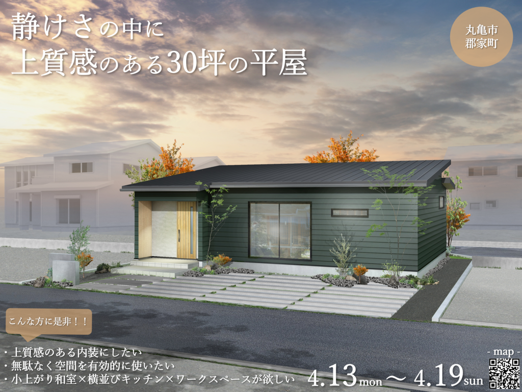 | タイトル | 《丸亀市郡家町》静けさの中に上質感のある 30坪の平屋 |