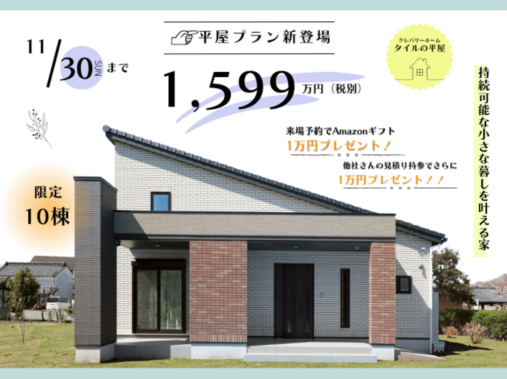 | タイトル | 残△平屋プラン新登場🏠Amazonギフト最大2万円プレゼント⭐⭐ |
