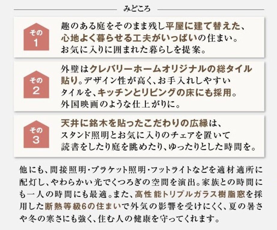 ①趣のある庭が四季の移り変わりを感じさせてくれる、自然を感じる平屋での生活。庭の手入れや季節ごとの風景を楽しむことで、心豊かな暮らしが実現できます。