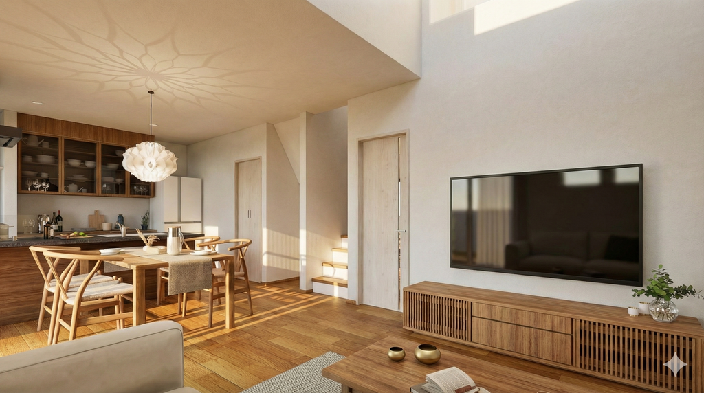 南向きのリビングは、吹き抜けから降り注ぐ柔らかな陽光に満ちた開放的な空間。