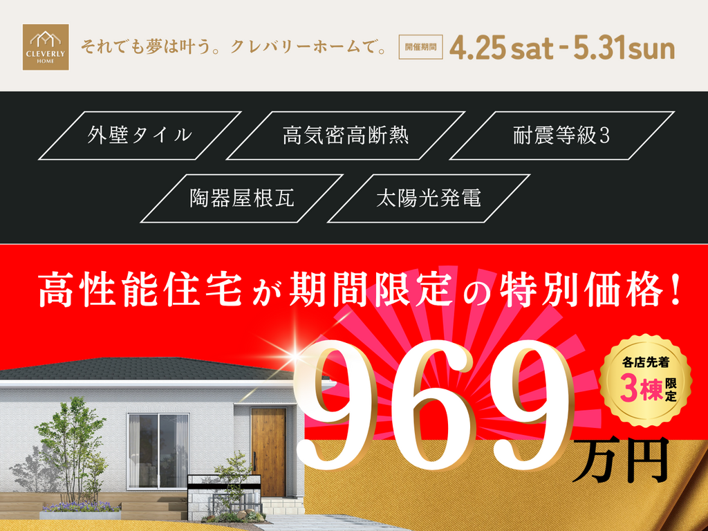 安さの理由は「低品質」ではありません。将来の安心と快適性を守るためのクレバリーホームが誇る性能は、本キャンペーン限定の特別仕様。長年培ってきた技術と知識を生かした妥協しない家づくりを叶えます。