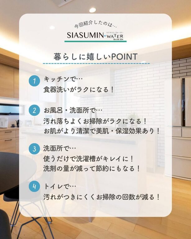 さらにこちらの住宅には、家じゅうの水をウルトラファインバブルにする「シアスミンウォーター」を導入済み。クレバリーホームでは、タイルと並ぶ人気商品です。 ウルトラファインバブルは、ナノサイズの微細な気泡のこと。あらゆる汚れの隙間に入り込んで剥がして洗い流します。お顔や頭皮の毛穴汚れ、キッチンでの油汚れ、浴室や洗面所などの水回り、お洗濯などさまざまな汚れの除去に効果を発揮します。 「シアスミンウォーター」は、電源もフィルター交換も不要。信頼の品質認証で長期使用が可能です。