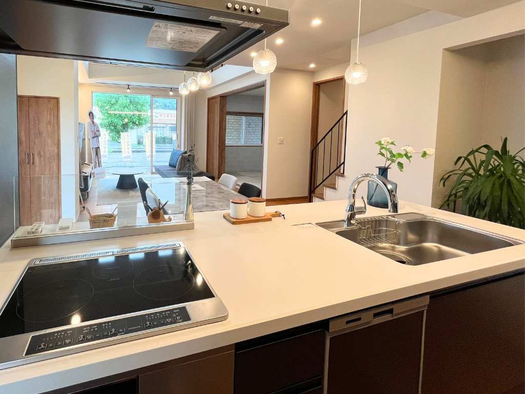 料理をするだけでなく、家族と食事をしたり、くつろいだり家事動線を意識することで調理、洗い物、配膳などの効率よく作業することができるキッチン。