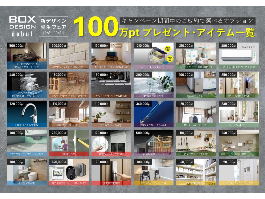 キャンペーン期間中にご成約いただいた方には、最新の住宅オプションと交換できる100万ポイントをプレゼントします!