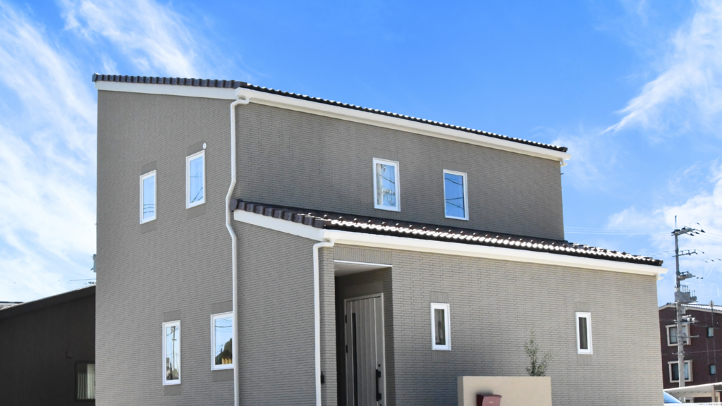 優しいアイボリーの外壁が街の風景に穏やかに溶け込みつつ、アクセントタイルと重厚感のあるブラウンの瓦屋根が相まって、