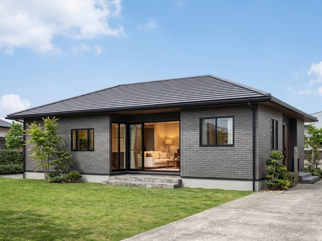 ブラック、ダークブラウン、ホワイトを組み合わせた和モダンなデザインと、水平軒天が美しい寄棟屋根が建物をより一層引き立てます。