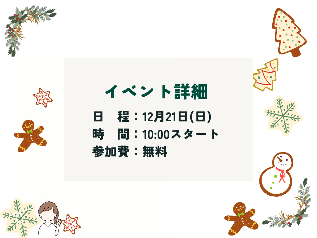 | タイトル | 【限定3名】子どもと楽しむクリスマスワークショップ! |