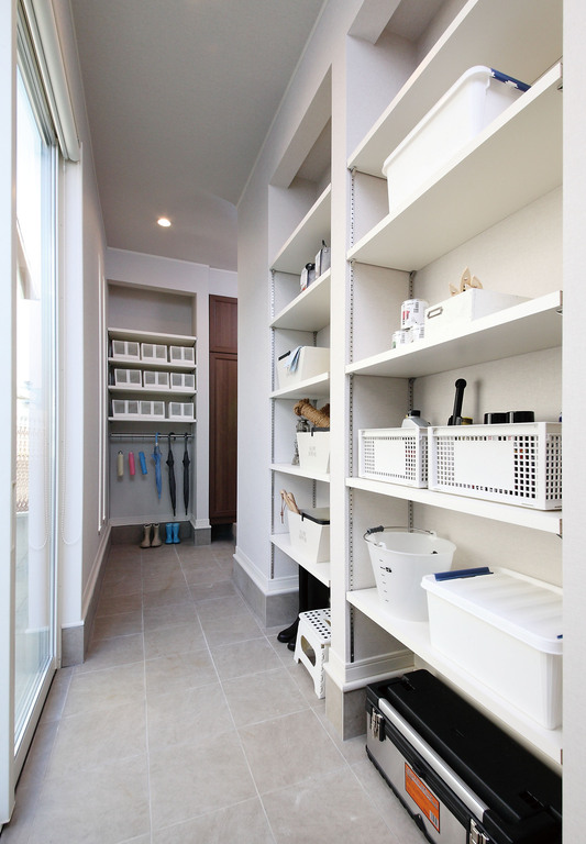 玄関横には、日用品やアウトドアグッズをしっかり収納できる