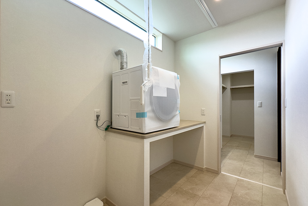 ランドリールームには乾太くんを設置。できるだけ「干す」手間を減らすことで、手間を減らすだけでなくバルコニーも割愛。
