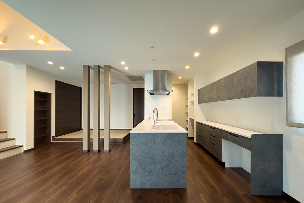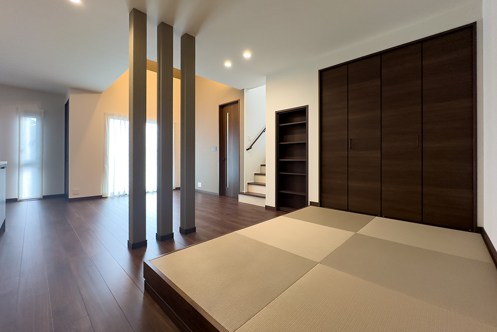吹抜けと畳コーナーのある開放的なリビングと、生活感を隠しながらも使いやすさを追求した家事動線。