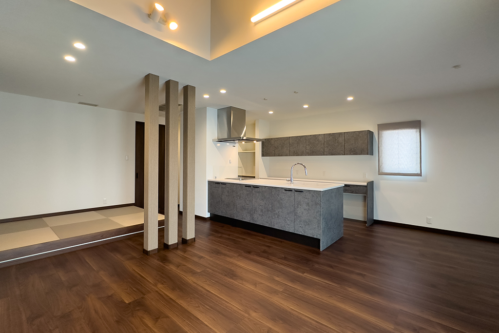 吹抜けのある明るいリビングと、横付けレイアウトのダイニングキッチン、小上がりの畳コーナーが一体としてつながる大空間のLDK。