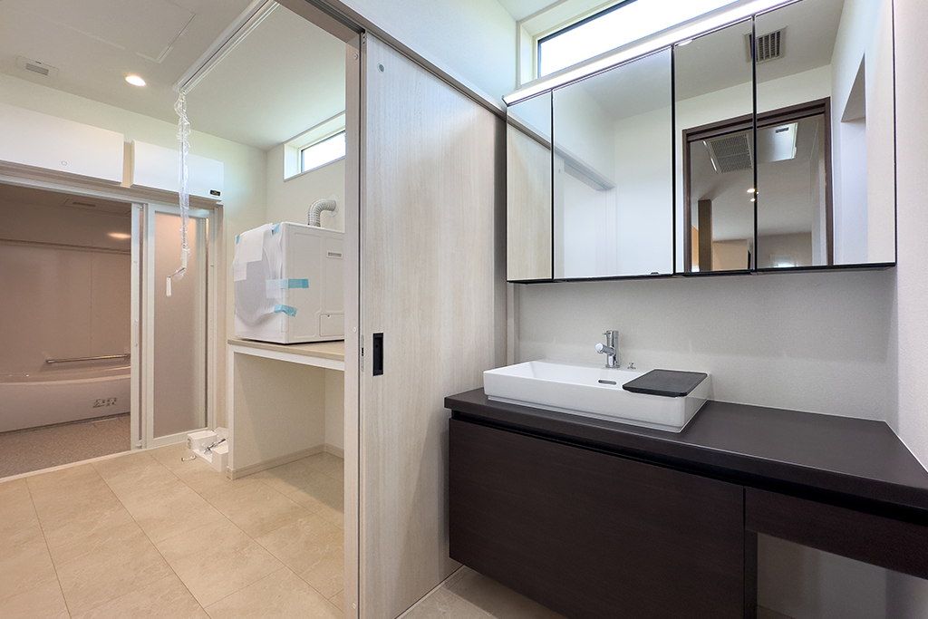明るい洗面台を中心とした、ランドリールームとファミリークローゼットの横動線。