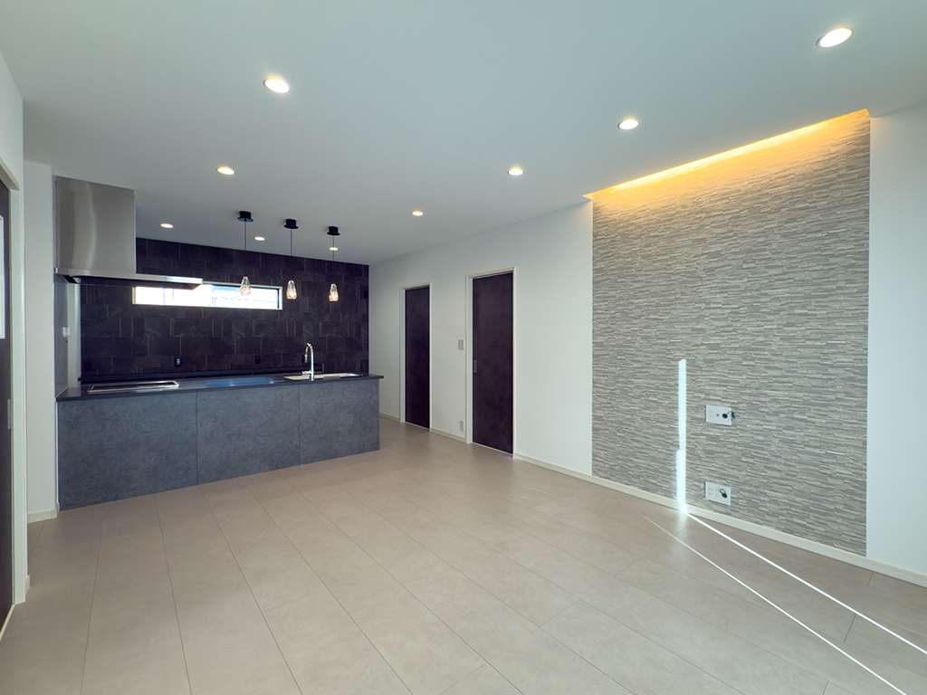 モノトーンを基調としたインテリアと柔らかな間接照明の光が上質感を演出、デザイン性の高いフルフラットキッチンがリビング・ダイニングと調和し、広々とした開放感を演出します。