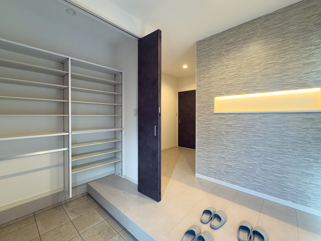 玄関ホールには、帰宅後すぐに片付けられる大きなファミリークローク。