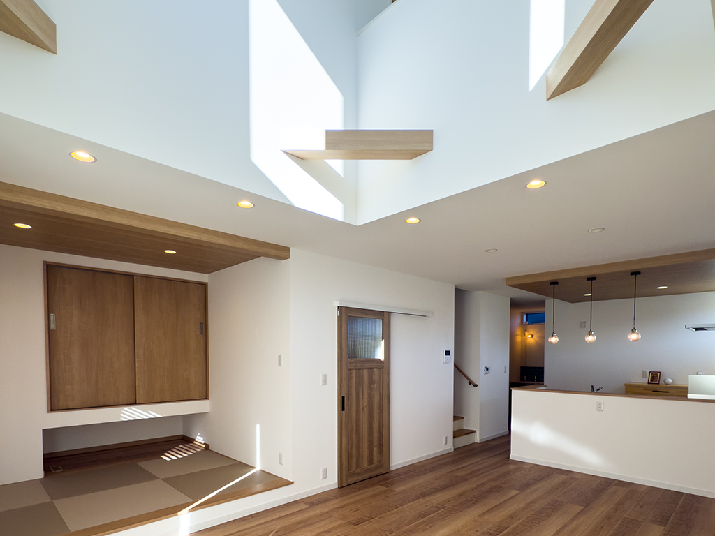 住まいの中心となるLDKは、圧倒的な開放感を誇る吹き抜けリビング。