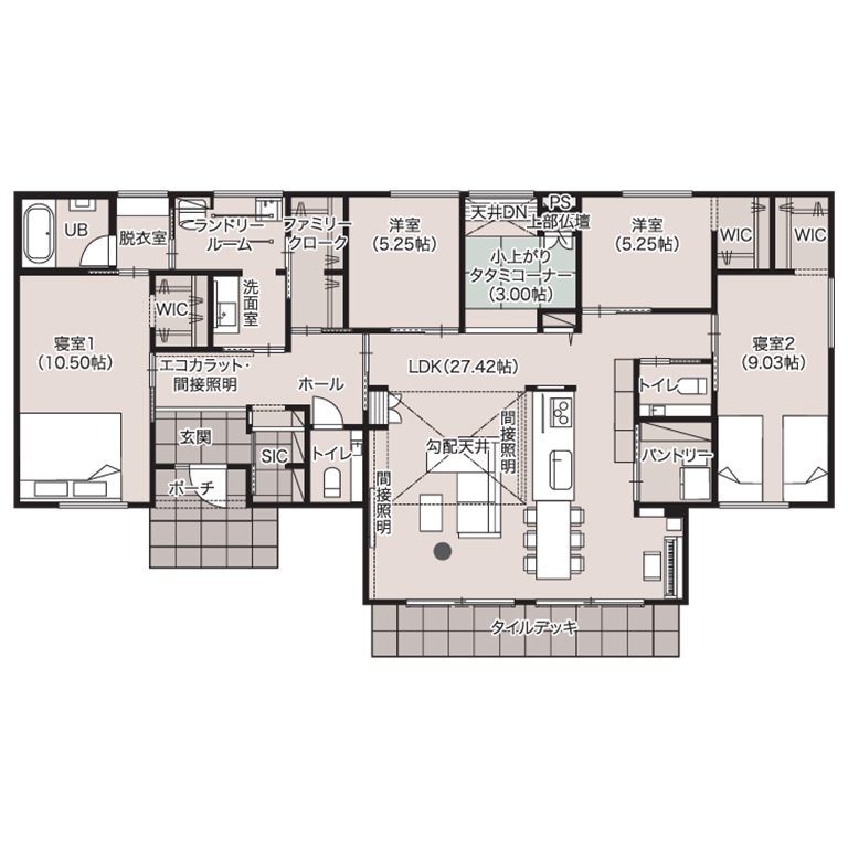 ランドリールームとファミリークローゼットを隣接させた配置は、「洗う → 干す → しまう」のステップが最短で完結するため、毎日の家事負担を大幅に軽減。