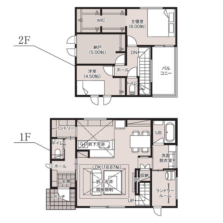 折上・折下天井と間接照明が空間に豊かな表情と奥行きを演出し、心地よいゆとりと非日常的な「ホテルライク」な時間をもたらします。