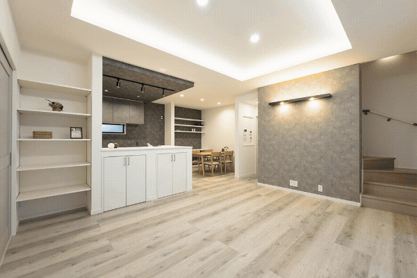 奥行きを感じさせる照明デザインと、家事の負担を軽減する回遊動線。