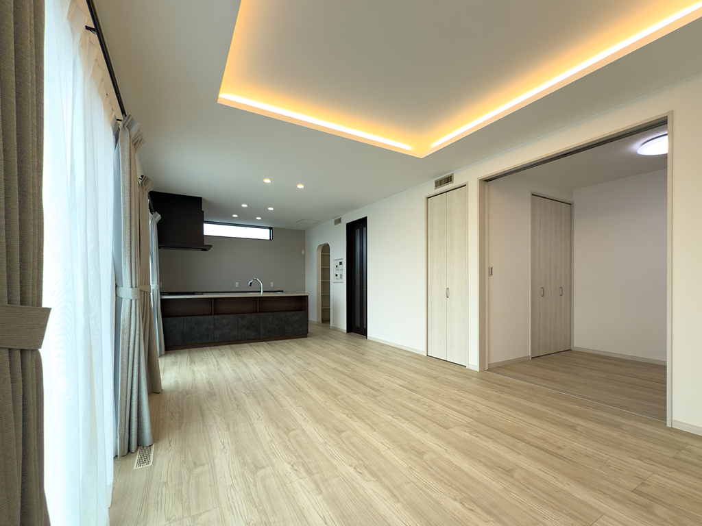 明るい光が差し込むLDKは、家族がどこにいてもお互いの気配を感じられる、落ち着いた空間。
