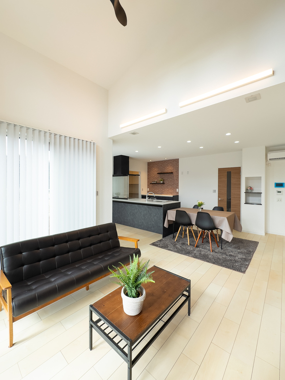 屋根の形状を活かした「勾配天井」の吹き抜けが、平屋とは思えないほどの開放感を演出します。