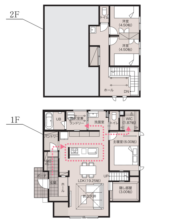 玄関からLDKへ向かうメイン動線に加え、シューズインクロゼットからパントリーへ直結する「お買い物動線」を確保。