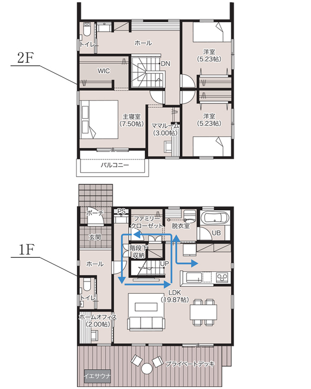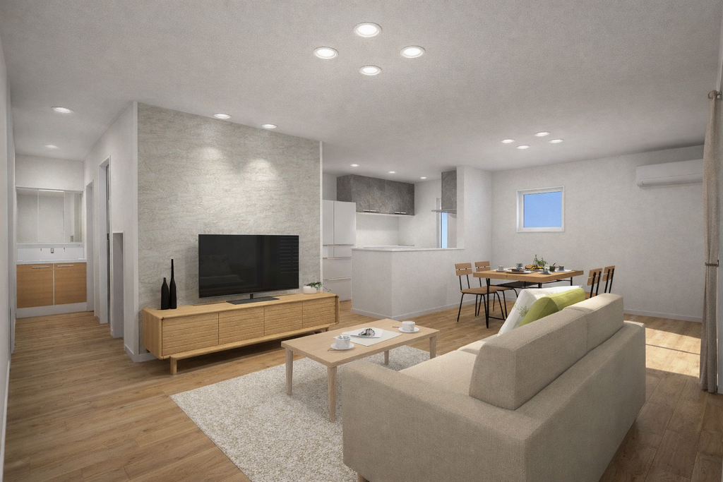 LDKを中心に、洗面→ファミリークローゼット→ランドリールームを効率よく結んだ回遊動線。