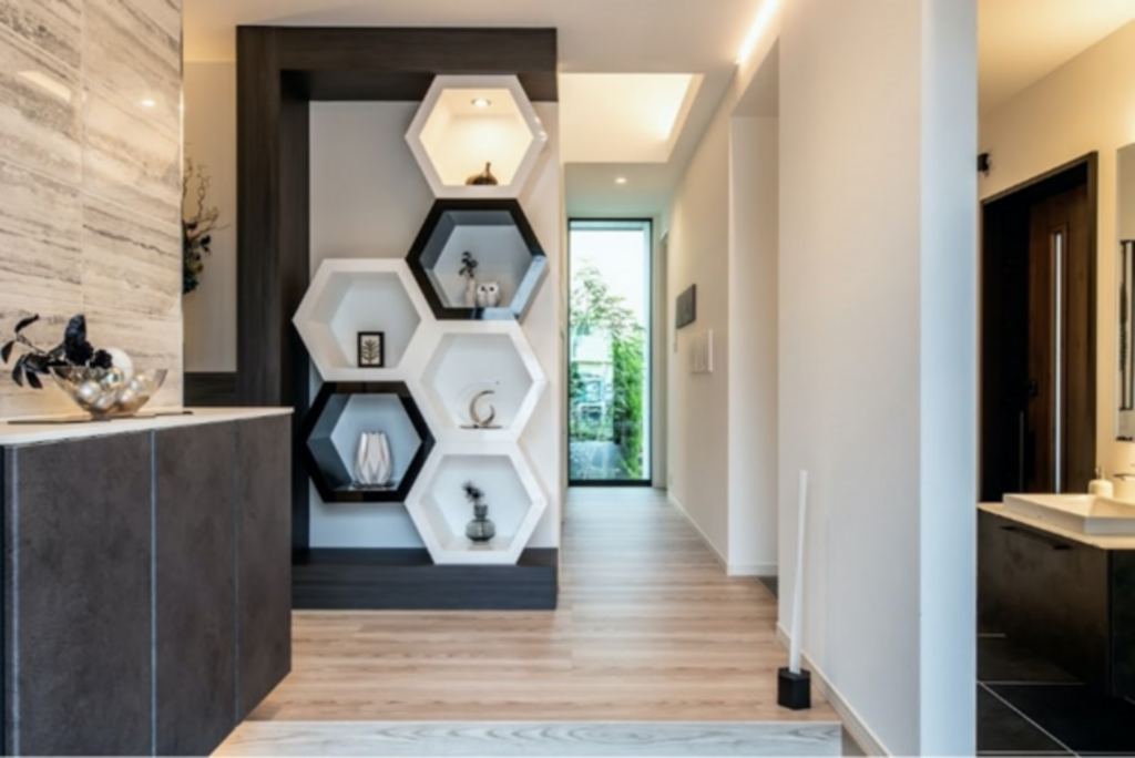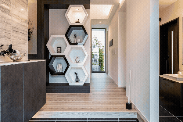 飾り棚と間接照明のデザインが帰宅時のテンションを上げるスタイリッシュな玄関。