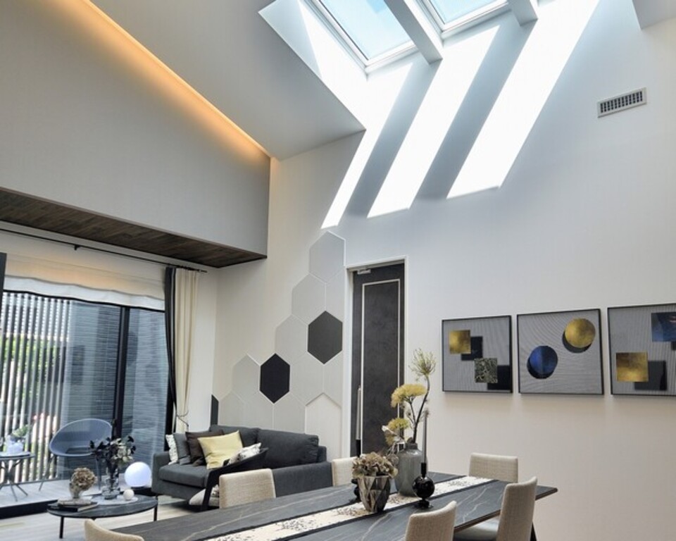 天窓から光が差し込む吹き抜けリビング