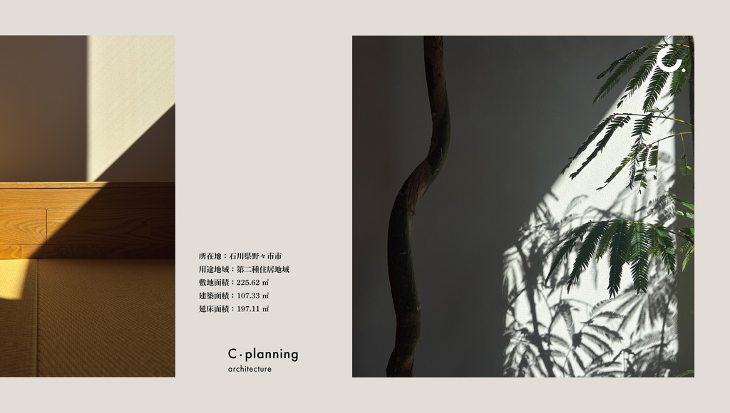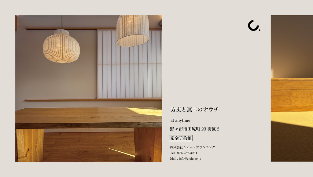 株式会社シィー・プランニングが手掛ける無二の設計建築空間。場所は野々市市が新たな街並みとして都市基盤整備を行っているひびきのまちに位置しており、健康・福祉・防災をテーマとする環境共生型の住環境の創出するエリアの一角です。建物は方丈をテーマにしたいくつかの空間があり、オフィスやショールーム、住居空間などいくつかの要素を兼ねた構成のコンセプトハウスとしています。社員の働く空間であり、お客様を迎える空間でもあるこの建物は、誰もが心地よい、常にやわらぎを感じる場所となるよう木のある空間とし、不思議と妙理白山と見える無二の空間です。