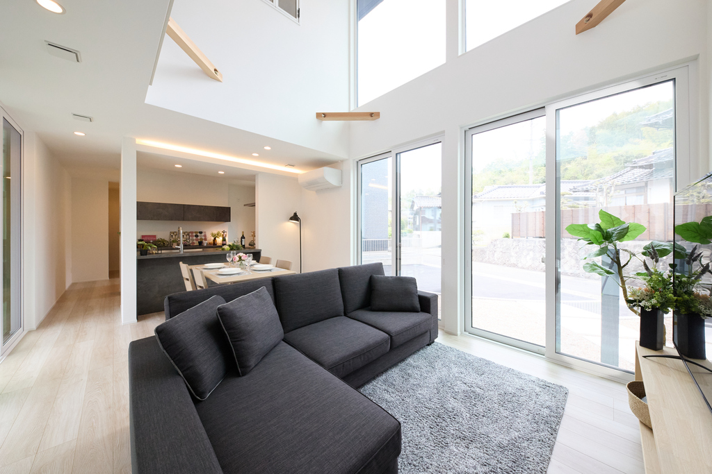 天井まで広がる吹き抜けリビングは、明るさと開放感を演出し家族が自然と集まる心地よい空間を生み出します。また、高性能な断熱ガラスと気密性の高いサッシを採用し、冬でも暖かく快適に過ごせます。