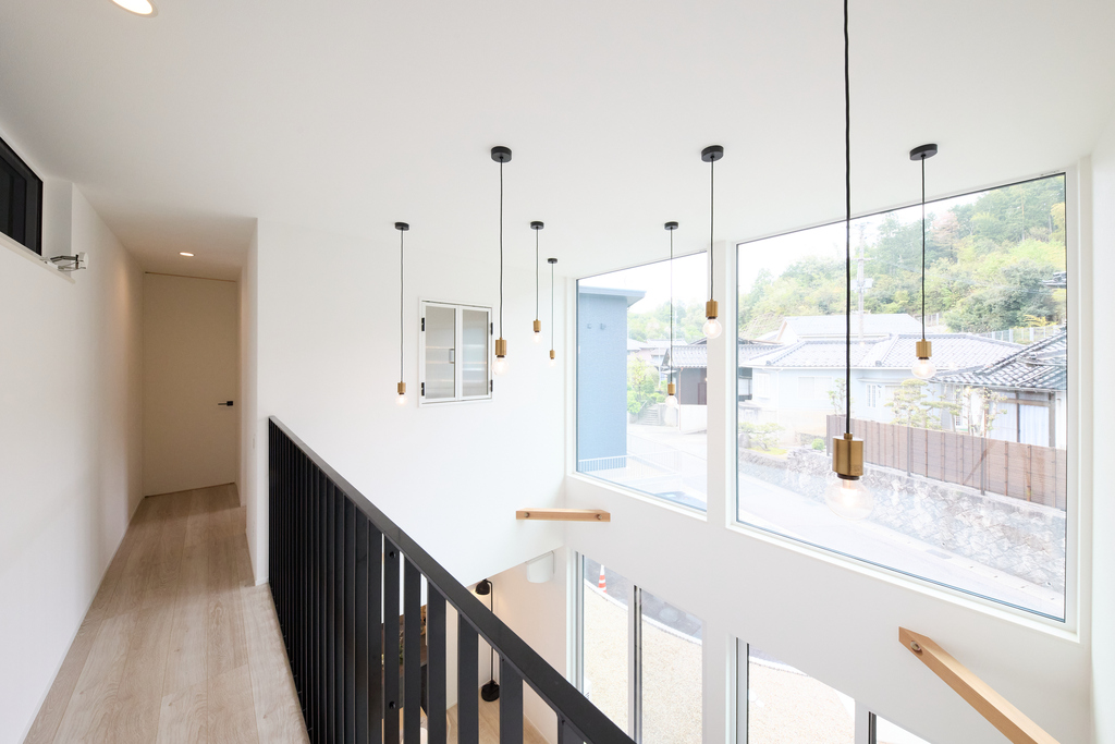 吹き抜けの開放感と2階廊下からの美しい眺めが魅力のデザイン住宅。大きな窓から差し込む自然光と、統一感のあるインテリア・照明が洗練された空間を演出し、どこにいても心地よさを感じられる住まいです。