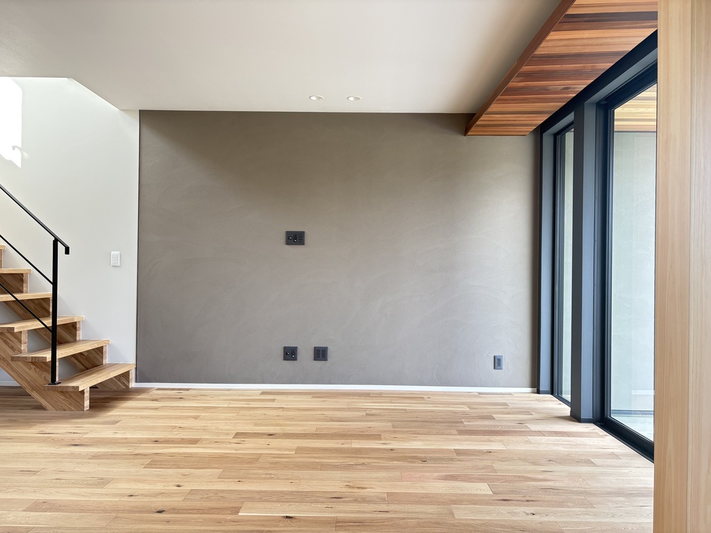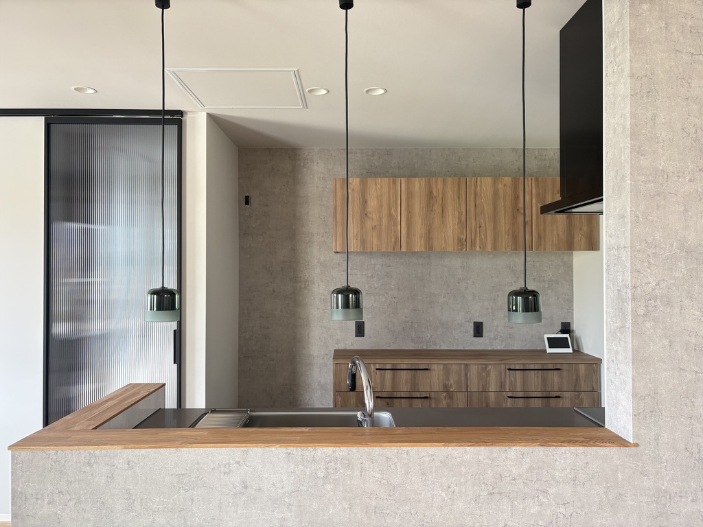 グレーの壁と木目の質感が調和した、落ち着きある大人の空間。