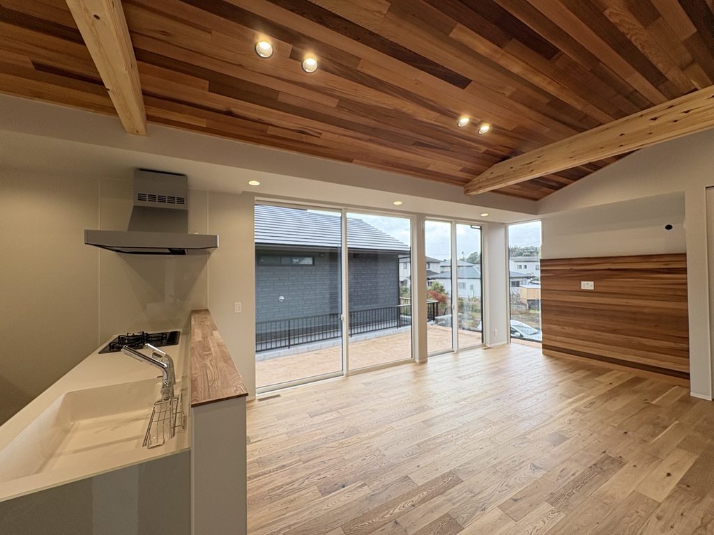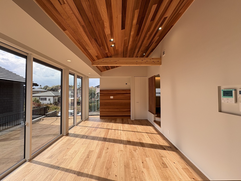 勾配天井×板張りが生む、平屋とは思えない開放感