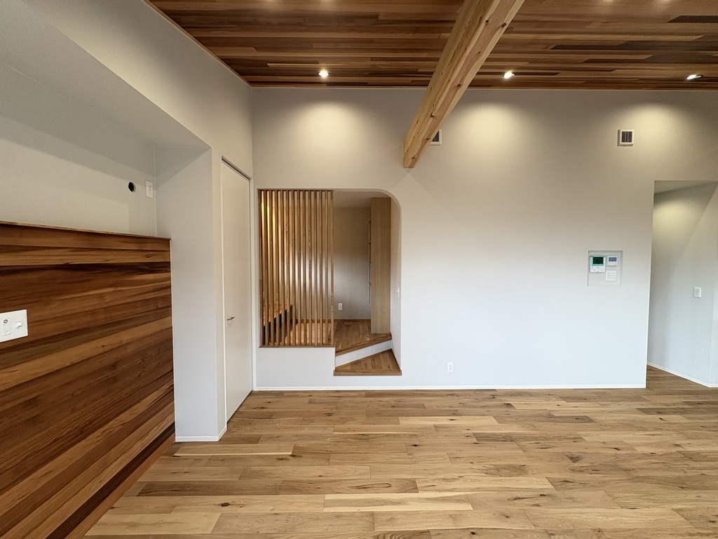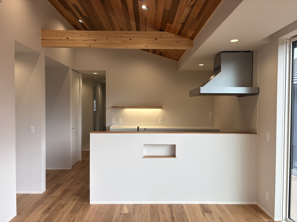 天井一面に施した木板張りと化粧梁が、視線を上へと導き、空間にリズムと温もりを与えます。