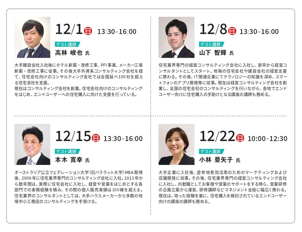 住宅の専門家として「良い住宅会社の選び方」を中立的な立場で解説するゲスト講師と、