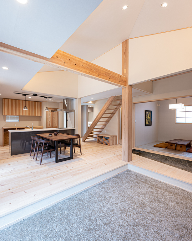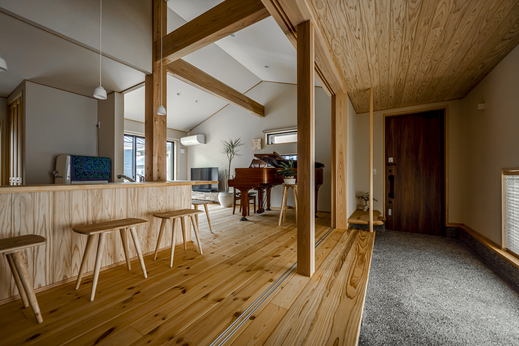 土間を隔てた離れ和室のある木の家
