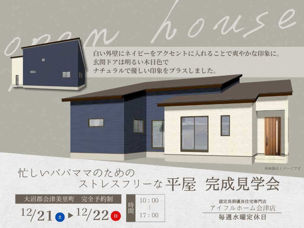 | タイトル | 【会津店】忙しいパパママのためのストレスフリーな平屋完成見学会 |