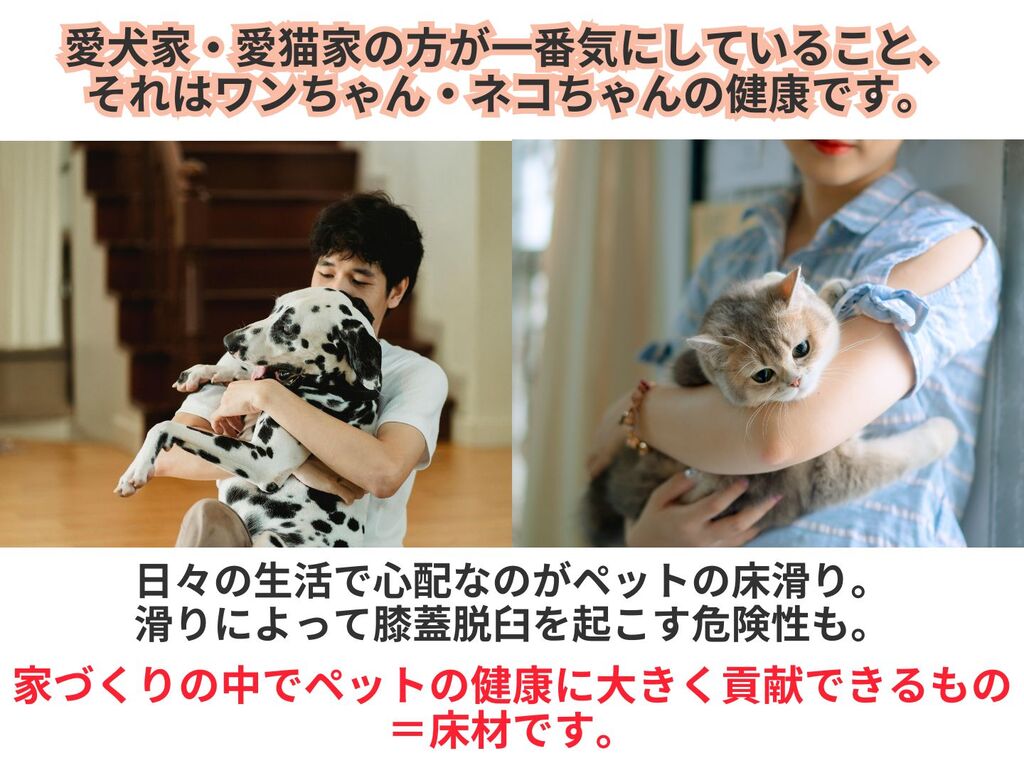 一般的なフローリングに比べて、ペットが歩いたり走ったりする際に滑りにくいため、足腰への負担が軽減されます。