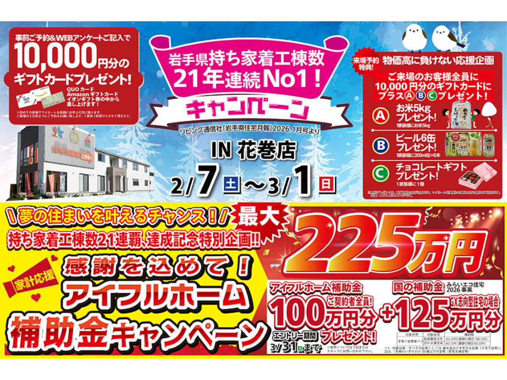 | タイトル | 【花巻店】おかげさまで創立30周年!持ち家着工棟数20年連続1位達成記念キャンペーン |