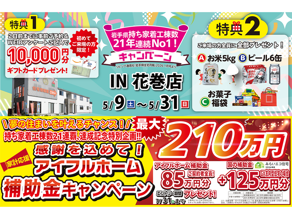 | タイトル | 【花巻店】おかげさまで創立31周年!持ち家着工棟数21年連続1位達成記念キャンペーン【新築住宅】 |
