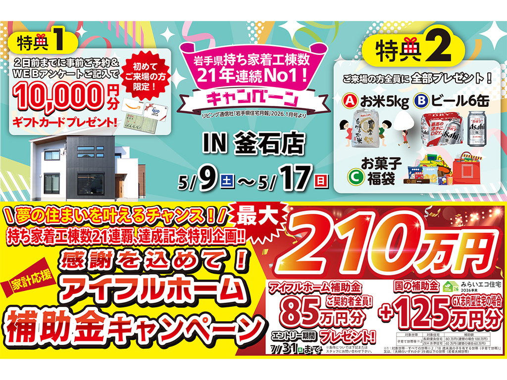 | タイトル | 【釜石ステーション】おかげさまで創立31周年!持ち家着工棟数21年連続1位達成記念キャンペーン |