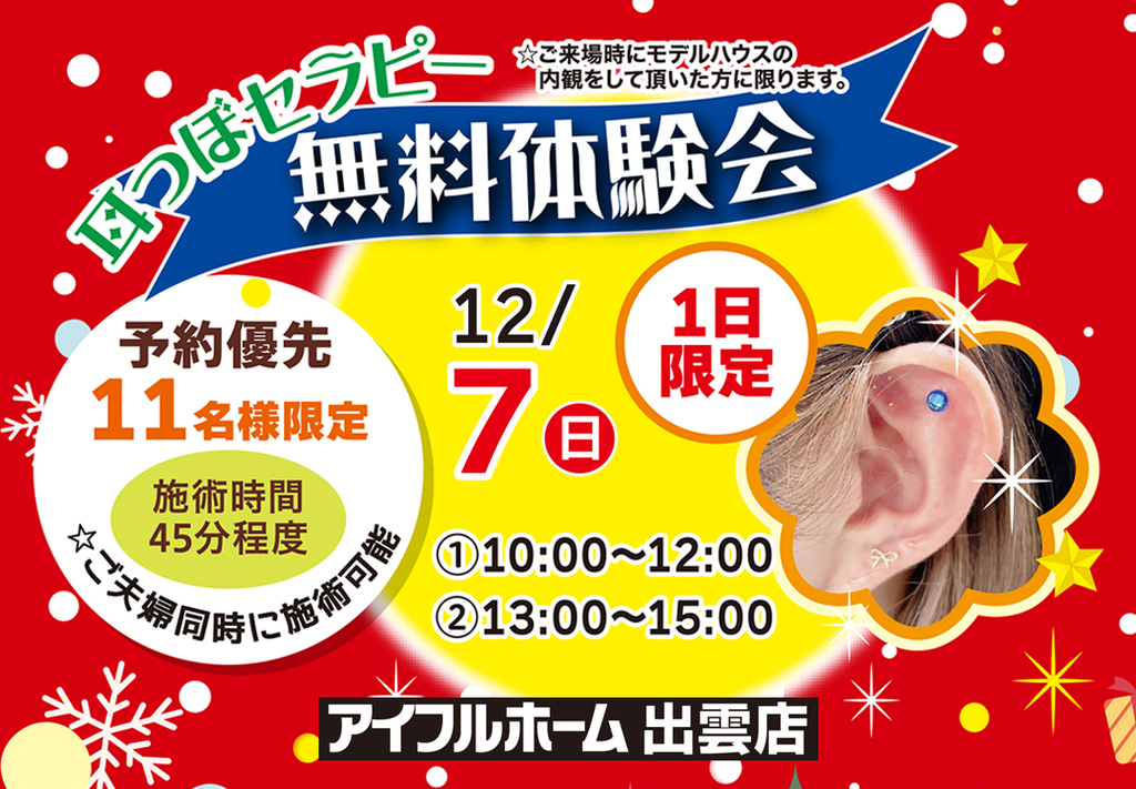 12/7(日)【出雲店】💎耳つぼセラピー<無料体験会>クリスマスフェア(住み心地体感)