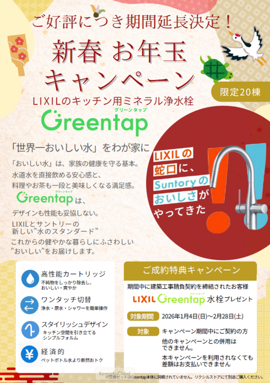 | タイトル | 【春日井店】2月限定成約特典 Greentapプレゼント★先着20棟限定 |