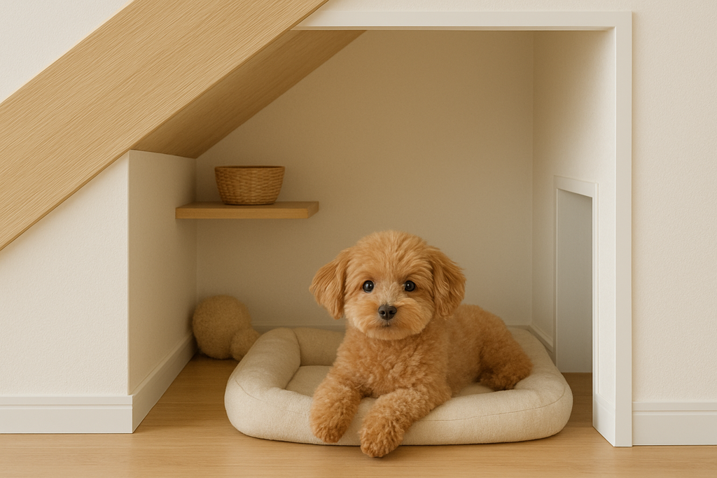 床材は愛犬の足にやさしい素材を採用。さらに階段下にはペット専用スペースを設け、家族と一緒に安心して過ごせる住まい。