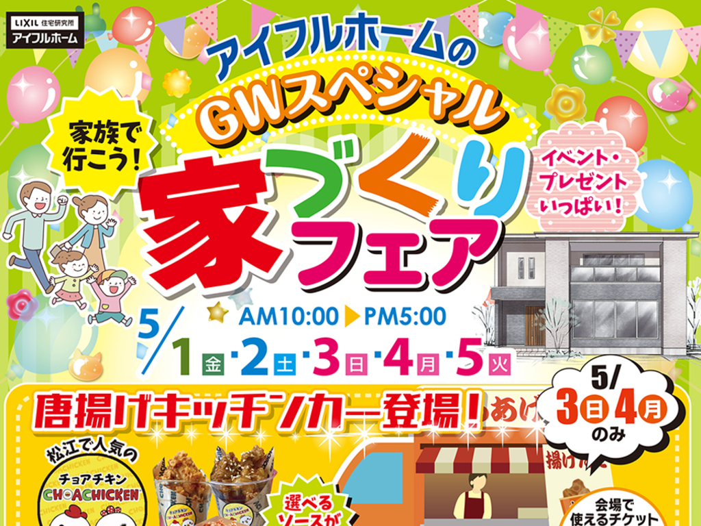 | タイトル | 5/1-5【松江店】アイフルホームのGWスペシャル『家づくりフェア』(住み心地体感) |