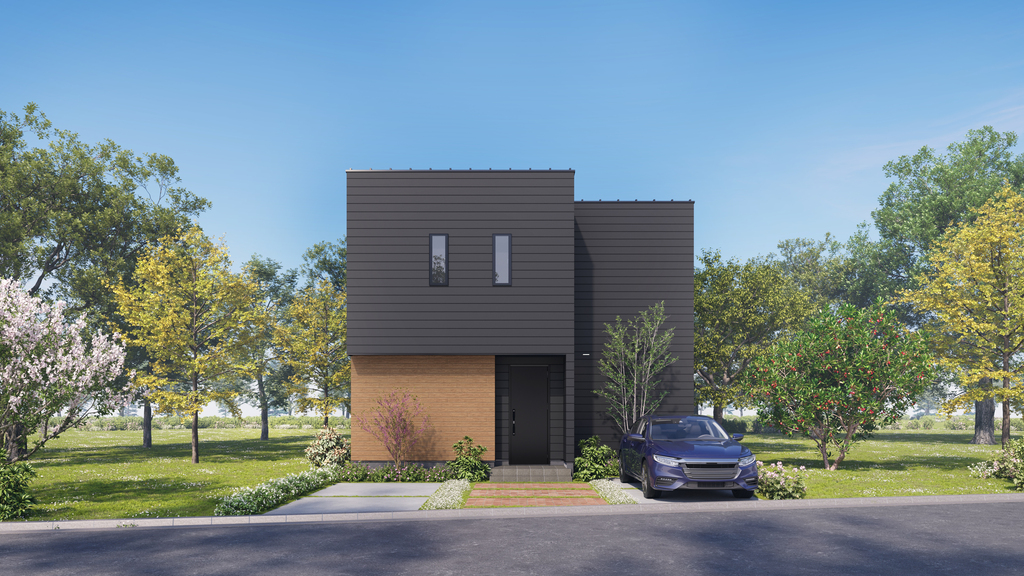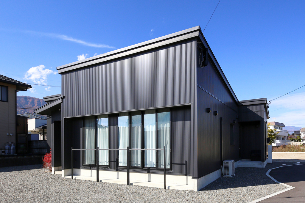 シンプルかつスタイリッシュなガルバリウムの外壁に一部ウッドサイディングを組み合わせることで、かっこよさと温かみを両立した外観に仕上げました。